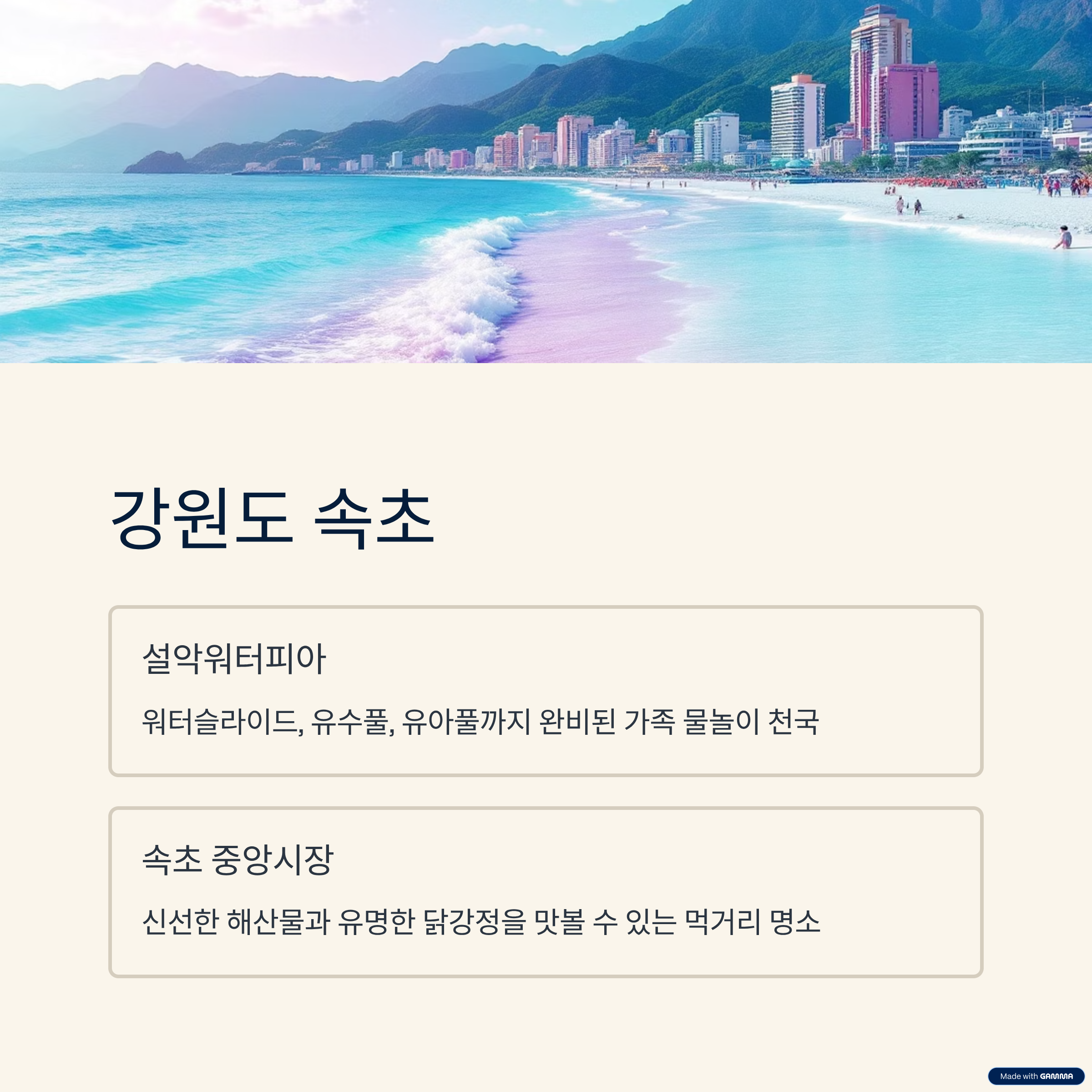 | 속초 | 바다+산+시장 | 설악워터피아, 닭강정 맛보기 |