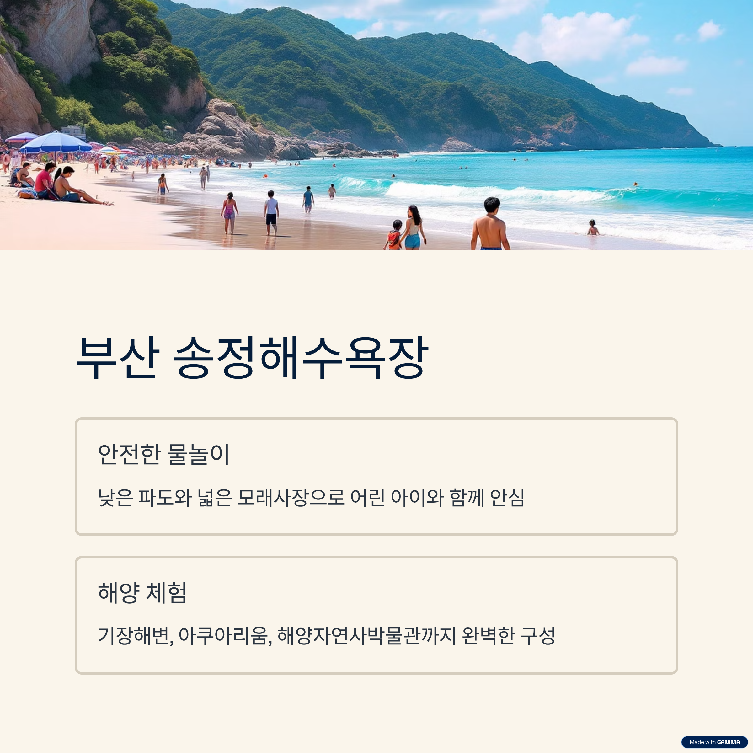 송정해수욕장은 파도는 낮고 모래사장은 넓어 어린아이와 함께 안전하게 물놀이를 즐길 수 있습니다.