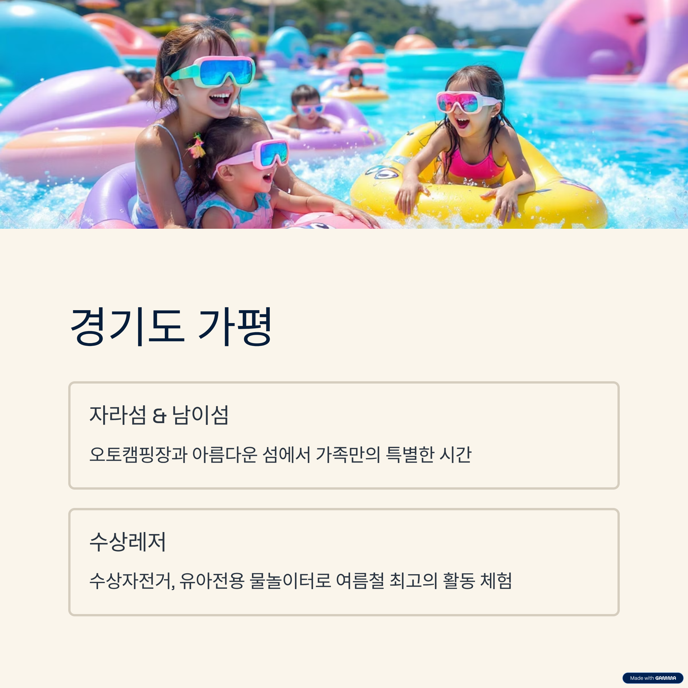 | 물놀이 테마파크 | 워터슬라이드, 유아풀 등 어린이 맞춤 시설 |