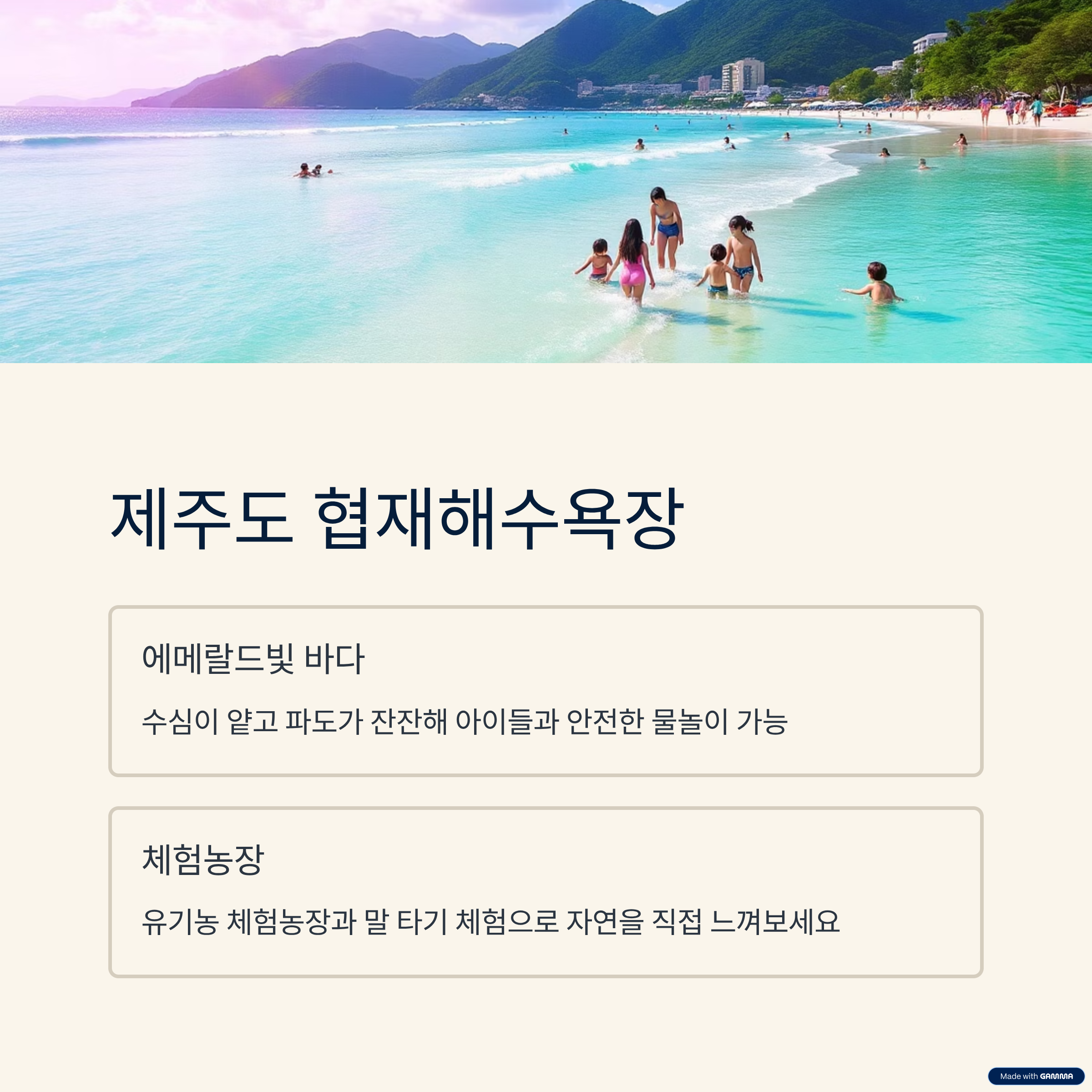 | 협재해변 | 얕은 바다+체험농장 | 물놀이, 말 타기 체험 |